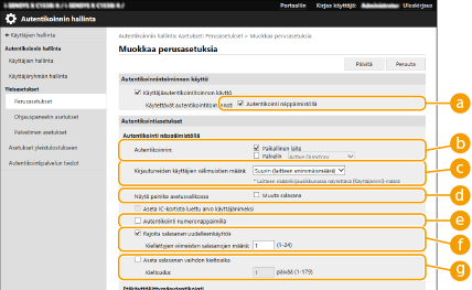 Valitse [Käyttäjäautentikointitoinnon käyttö] -valintaruutu ja määritä tarvittavat asetukset.