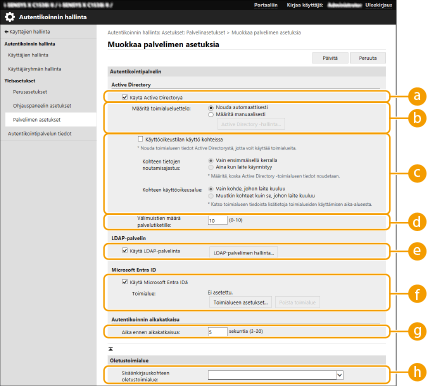 ![]() | Jotta Active Directory, Microsoft Entra ID tai LDAP-palvelin voidaan määrittää lisäautentikointilaitteeksi, joudut rekisteröimään autentikointiin käytettävän palvelimen tiedot. Suorita yhteystesti tarvittaessa. |