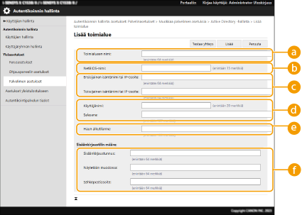 4 | Syötä tarvittavat tiedot. ![]() [Toimialueen nimi:]Lisää kirjautumiskohteena olevan Active Directoryn toimialueen nimi (esimerkki: company.domain.com). [NetBIOS-nimi]Kirjoita NetBIOS-toimialueen nimi (esimerkki: company). [Ensisijainen isäntänimi:] / [Toissijainen isäntänimi]Kirjoita Active Directory -palvelimen isäntänimi tai IPv4-osoite. Jos käytät toissijaista palvelinta, määritä nimi kohdassa [Toissijainen isäntänimi]. Esimerkki: Isäntänimeä käyttäen: ad-server1 IPv4-osoitetta käyttäen: 192.168.18.138 [Käyttäjänimi:] / [Salasana:]Syötä käyttäjänimi ja salasana joita käytetään haettaessa Active Directory -palvelinta. [Haun alkutilanne:]Määritä Active Directory Serverissä käytettävä ja haettava sijainti. [Sisäänkirjaustunnus:] / [Näytetään muodossa] / [Sähköpostiosoite]Määritä kirjautumisnimen tietokentät (määreiden nimet), näyttönimi ja kunkin Active Directory -palvelimen käyttäjätilin sähköpostiosoite (esimerkki: sAMAccountName, cn, mail). |