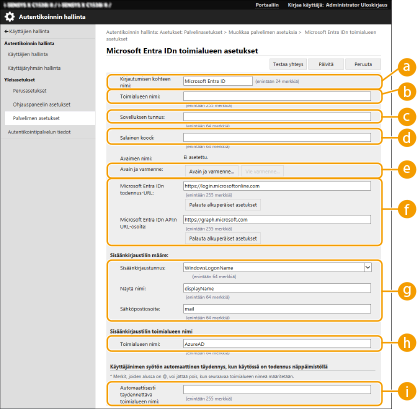 2 | Syötä tarvittavat tiedot. ![]() [Kirjautumisen kohteen nimi:]Syötä näyttönimi kirjautumiskohteelle. Oletusarvo:Microsoft Entra ID [Toimialueen nimi:]Syötä kirjautumiskohteena olevan Microsoft Entra ID -toimialueen nimi. [Sovelluksen tunnus:]Syötä sovellustunnus (asiakas). [Salainen koodi:]Syötä Microsoft Entra ID -salauskoodi. Kun käytössä on [Avain ja varmenne], sitä ei tarvita. [Avain ja varmenne]Valitse [Avain ja varmenne], kun käytät avainta ja varmennetta. Valitsemalla [Vie varmenne] voit viedä varmenteen, joka on rekisteröity Microsoft Entra ID:hen. [Microsoft Entra IDn todennus-URL] / [Microsoft Entra IDn API:n URL-osoite:] Syötä URL-osoite. Sitä voi olla tarpeen muuttaa käytettävästä pilviympäristöstä riippuen. Valitsemalla [Palauta alkuperäiset asetukset] voit palauttaa kohteen [Microsoft Entra IDn todennus-URL] / [Microsoft Entra IDn API:n URL-osoite:] URL:n oletusarvon. Oletusarvo: [Microsoft Entra IDn todennus-URL]: https://login.microsoftonline.com [Microsoft Entra IDn API:n URL-osoite:]: https://graph.microsoft.com [Sisäänkirjaustunnus:] / [Näytä nimi:] / [Sähköpostiosoite:] Syötä tietokenttien (määritteiden) nimet, joihin kunkin käyttäjätilin kirjautumisnimi, näyttönimi ja sähköpostiosoite on rekisteröity Microsoft Entra ID -palvelimessa. Oletusarvo: WindowsLogonName, displayName, mail Esimerkki: userPrincipalName, displayName, mail [Toimialueen nimi:] Useimmissa tilanteissa asetusta ei tarvitse muuttaa. Oletusarvo: AzureAD [Automaattisesti täydennettävä toimialueen nimi:] Syötä automaattisesti annettava toimialueen nimi. Sinun ei tarvitse syöttää toimialueen nimeä @-merkin jälkeen. |