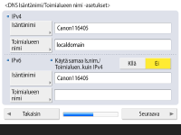Määritä DNS-palvelimen osoite, DNS-isäntänimi ja DNS-toimialueen nimi. ![]() ![]() Valitse <Ensisijainen DNS-palvelin> ja <Toissijainen DNS-palvelin>, kirjoita DNS-palvelimen IPv4-/IPv6-osoite ja valitse <Seuraava>. Tietoja DNS-palvelimen osoitteen asetuksista on kohdassa DNS-asetusten määrittäminen. ![]() ![]() Kirjoita laitteen nimi (isäntänimi) valitsemalla <Isäntänimi>. Kirjoita toimialueen nimi, johon laite kuuluu, valitsemalla <Toimialueen nimi> ja valitse sitten <Seuraava>. Jos IPv4- ja IPv6-asetukset ovat samat, valitse <Kyllä> kohdassa <Käytä samaa Is.nim./Toimialuen. kuin IPv4>. ![]() ![]() Päivitä automaattisesti käyttämällä DNS-dynaamisen päivityksen asetuksia valitsemalla <Kyllä> kohdassa <Dynaaminen DNSpäivitys>. Valitse sitten <OK>. Jos <Dynaaminen DNSpäivitys> -asetuksena kohdassa <IPv6> on <Kyllä>, voit rekisteröidä kohteet automaattisesti valitsemalla <Kyllä>. | |