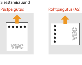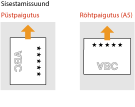 See osa kirjeldab, kuidas laadida õige paigutusega eelnevalt prinditud paberit. Paberi üldist laadimisprotseduuri paberisahtlisse või universaalalusele vaadake osast Paberi laadimise põhimeetod. See osa kirjeldab, kuidas laadida eelnevalt prinditud paberit, kui kopeerite/prindite ühepoolselt. Kui kopeerite/prindite kahepoolselt eelnevalt prinditud paberile, laadige paber vastavalt selle osa kirjeldustele, nii et paberi poole asetate vastupidiselt kirjeldustele. Selleks et prinditaks eelnevalt prinditud paberi õigele poolele nii ühe- kui kahepoolse printimise puhul, saate kasutada järgmisi seadistamise meetodeid. Selleks et paberi tüüpi iga kord printimiseks täpsustada: laadige paberi tüüp, mis on registreeritud „Eelnevalt prinditud paberi” all, <Sees> jaotises <Paberitüübi halduse seaded>, täpsustage selle paberi tüüp ja printige. Selleks et paberiallikat iga kord printimiseks täpsustada: laadige paber paberiallikasse, <Paberisöödu meetodi lülitamine> jaotises <Printimise eelistus>, täpsustage selle paberi allikas ja printige. Õige moodus eelnevalt prinditud paberi laadimiseks, kui „Eelnevalt prinditud paberi” seadistus on <Sees> jaotises <Paberitüübi halduse seaded> või kui <Paberisöödu meetodi lülitamine> on seadistatud <Printimise eelistus> peale Paberisahtel: logoga pool ülal Paberiallikaks ei ole paberisahtel: logoga pool all |