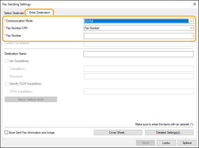 Klõpsake vahekaarti [Enter Destination] ja määrake siderežiim ja faksinumber, mida soovite kasutada.