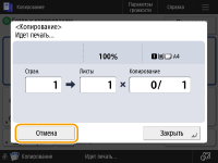 Если нажать на панели управления клавишу (Стоп), когда имеются ожидающие задания копирования, все задания копирования приостанавливаются, а на дисплее отображаются сообщение <СтопВыбер. задание на копир., которое необх. отменить.> и список заданий копирования. Выберите в списке задание копирования, которое нужно отменить, и нажмите кнопку <Отмена>. Чтобы возобновить копирование, нажмите кнопку <Возобн. копир.>. |