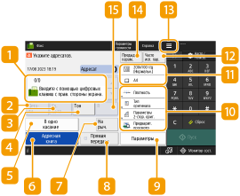 В этой области представлены сведения о состоянии параметра, такие как разрешение. Подтвердите параметры, чтобы сканирование было выполнено должным образом. Для изменения параметров нажмите соответствующую кнопку. Основные операции отправки факсов