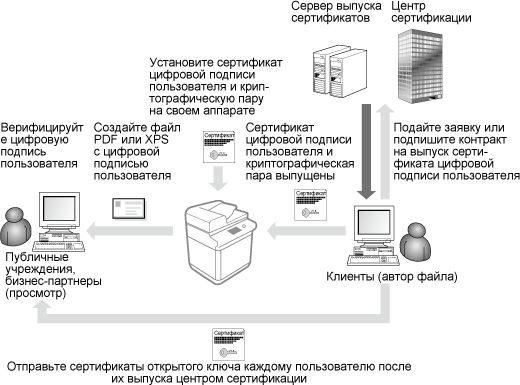 ![]() | Ключ и сертификат (сертификат пользователя), которые требуются для добавления подписи пользователя, можно зарегистрировать через Remote UI (Удаленный ИП). Следует назначить администратора, ответственного за регистрацию ключей и сертификатов. После этого на отсканированные документы, отправляемые в виде файлов определенного формата, можно добавлять цифровую подпись пользователя, вошедшего в систему аппарата с помощью функции управления аутентификацией для личных пространств. Добавление цифровой подписи |