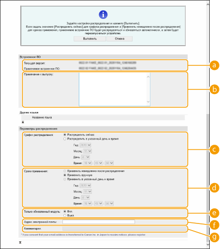 Чтобы сразу приступить к загрузке ПО, установите переключатель [Распределить сейчас]. Чтобы автоматически загрузить встроенное ПО в указанные дату и время, установите переключатель [Распределить в указанный день и время] и укажите необходимые данные в полях [Год]/[Месяц]/[Date]/[Время]. Обновление можно запланировать заранее (в течение недели).