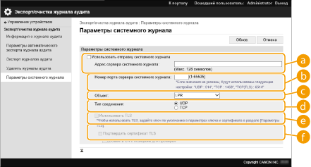 В некоторых журналах аудита после ошибки может наблюдаться незначительная задержка, поскольку передача на сервер Syslog происходит после опроса каждые 30 секунд. Поддерживаются следующие RFC: 5424 (формат Syslog), 5425 (TLS) и 5426 (UDP). |