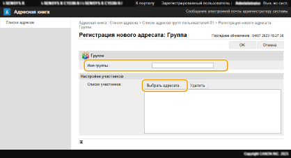 2 | Введите имя для группы в поле [Имя группы] и нажмите кнопку [Выбрать адресата] в разделе [Список участников]. ![]() |