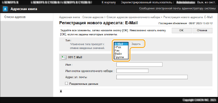 4 | Укажите необходимые сведения и нажмите кнопку [OK]. Отображаемые элементы зависят от типа адресата. Дополнительные сведения об информации для регистрации см. в разделе Регистрация адресатов в адресной книге. |