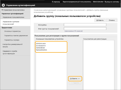 Нажмите кнопку [Добавить группу (локальные пользователи устройства)...] или [Добавить группу (другие пользователи)...].