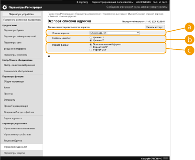 3 | Настройте необходимые параметры. ![]() [Списки адресов]Выберите списки адресов для экспорта. Обратите внимание, что после сохранения списков адресов их названия будут сброшены до заводских названий по умолчанию. [Уровень защиты]Если в разделе [Формат файла] выбран вариант [Пользовательский формат], то можно задать уровень безопасности. Если выбран [Уровень 1], параметры можно импортировать на все многофункциональные аппараты Canon. Если выбран [Уровень 2], пароль для доступа к данным списка адресов шифруется с помощью более безопасного метода, чем на уровне [Уровень 1]. Однако данные можно импортировать на модели аппаратов, которые поддерживают [Уровень 2] (на модели, на которых имеется параметр [Уровень защиты]). [Формат файла]Выберите формат файла с данными для экспорта. Выберите [Пользовательский формат], если требуется импортировать все сведения, зарегистрированные в списках адресов, на другой многофункциональный аппарат Canon, либо [Формат LDAP] или [Формат CSV], если файл планируется использовать в приложении на компьютере. Однако следует помнить, что при выборе варианта [Формат LDAP] сохраняются только адреса электронной почты и номера факсов. ![]() Защита экспортированных данных с помощью пароля Задайте для параметра <Включать пароль при экспорте адресной книги> значение <Вкл.> (<Включать пароль при экспорте адресной книги>). Если задан этот параметр, на экране [Экспорт списков адресов] отображаются элементы для ввода пароля. Если задан пароль, импортировать данные можно только после ввода правильного пароля. Правка данных, экспортированных в формате CSV Сведения о каждом столбце адресной книги см. в разделе Элементы адресной книги. Данные могут быть импортированы неправильно при выполнении импорта на старую версию аппарата. |