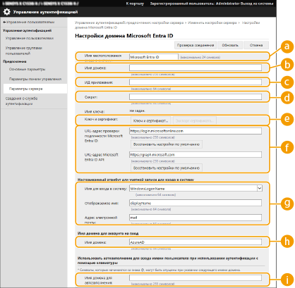 2 | Введите необходимую информацию. ![]() [Имя местоположения входа в систему:]Укажите отображаемое имя местоположения входа в систему. Значение по умолчанию: Microsoft Entra ID [Имя домена:]Введите имя Microsoft Entra ID, который является доменом местоположения для входа. [ИД приложения:]Введите идентификатор приложения (клиента). [Секрет:]Введите секретное значение, выданное вам для Microsoft Entra ID. При использовании варианта [Ключ и сертификат], ввод является необязательным. [Ключ и сертификат]Выберите [Ключ и сертификат] при использовании ключа и сертификата. Нажав [Экспорт сертификата], вы можете экспортировать сертификат, зарегистрированный для Microsoft Entra ID. [URL-адрес проверки подлинности Microsoft Entra ID] / [URL-адрес Microsoft Entra ID API:] Введите URL-адрес. В зависимости от вашей облачной среды вам может потребоваться изменить URL-адрес. Выберите [Восстановить настройки по умолчанию], чтобы восстановить [URL-адрес проверки подлинности Microsoft Entra ID] / [URL-адрес Microsoft Entra ID API:] до значений по умолчанию. Настройки по умолчанию: [URL-адрес проверки подлинности Microsoft Entra ID]: https://login.microsoftonline.com [URL-адрес Microsoft Entra ID API:]: https://graph.microsoft.com [Имя для входа в систему:] / [Отображаемое имя:] / [Адрес электронной почты:] Укажите имена полей данных (атрибуты), в которых зарегистрированы имя для входа, отображаемое имя и адрес электронной почты каждой учетной записи пользователя на сервере Microsoft Entra ID. Значение по умолчанию: WindowsLogonName, displayName, mail Пример: userPrincipalName, displayName, mail [Имя домена:] В большинстве случаев нет необходимости изменять настройки. Значение по умолчанию: AzureAD [Имя домена для автозаполнения:] Введите имя домена, которое будет вводиться автоматически. Вам не нужно вводить имя домена после символа «@». |