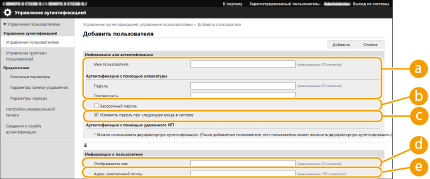 [Бессрочный пароль]Установите флажок, чтобы зарегистрировать пароль пользователя без срока действия. Этот параметр можно указать, если для параметра [Срок действия пароля] задано значение [Выкл.] в [Политика настройки паролей] в [Аутентификац.] в [Параметры политики безопасности].