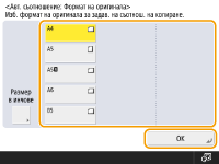 ![]() | Ако искате да копирате оригинали в свободен формат или силно прозрачни оригинали или ако искате да копирате с хартия, поставена в многофункционалната тава, трябва да изберете хартията ръчно. |
