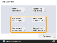 Ако искате да използвате ключ и сертификат, които сте генерирали сами, генерирайте ключа и сертификата, преди да извършите процедурата по-долу. Генериране на ключ и сертификат за мрежова комуникация Ако искате да използвате ключ и сертификат, които сте получили от отдел за сертифициране (СА), регистрирайте ключа и сертификата, преди да извършите процедурата по-долу. Регистриране на ключ и сертификат Ако зададете <Метод на кодиране на формат към FIPS 140> на <Вкл.>, можете да накарате метода на шифроване на TLS комуникацията да съответства на одобрения от правителството на САЩ стандарт FIPS (Federal Information Processing Standards) 140. <Метод на кодиране на формат към FIPS 140> Ако TLS версията е зададена на<TLS 1.0> или <TLS 1.1> и <Метод на кодиране на формат към FIPS 140> е зададен на <Вкл.>, TLS версията превключва на <TLS 1.2>. Ако <Метод на кодиране на формат към FIPS 140> е зададен на <Вкл.> и TLS версията е зададена на <TLS 1.0> или <TLS 1.1>, <Метод на кодиране на формат към FIPS 140> превключва на <Изкл.>. Ако <Метод на кодиране на формат към FIPS 140> е зададено на <Вкл.>, ще се появи грешка, ако опитате да посочите сертификат за TLS, който използва алгоритъм, който не е разпознат от FIPS (по-нисък от RSA2048bit). Ще се получи грешка в комуникацията, ако зададете <Метод на кодиране на формат към FIPS 140> на <Вкл.> и изпратите до отдалечена страна, която не поддържа алгоритми за шифроване, признати от FIPS. Ако <Метод на кодиране на формат към FIPS 140> е зададено на <Вкл.>, <CHACHA20-POLY1305>, <3DES-CBC> и <X25519> се превключва на <Изкл.>. Ако <CHACHA20-POLY1305>, <3DES-CBC>, или <X25519> е зададено на <Вкл.>, <Метод на кодиране на формат към FIPS 140> се превключва на <Изкл.>. |