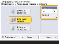 1 | Натиснете <Изтр. рамка на книга> и проверете <Формат оригин.>. ![]() Ако размерът, показан в <Формат оригин.>, е различен от размера на книгата, натиснете <Промяна> за избиране на размера. Само форматите на оригинали, показани на сензорния дисплей, могат да се сканират. |
