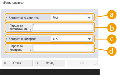 7 | Въведете необходимата информация. ![]() <Алгоритъм за автентик.>Изберете MD5, SHA1 или SHA2 според средата си. За SHA2 изберете от четири хаш дължини (224 бита, 256 бита, 384 бита или 512 бита). <Парола за автентикация>Въведете парола, която да използвате за удостоверяване. Когато бъде въведена паролата, се показва <Потвържда- ване> за потвърждение. Въведете паролата отново. <Алгоритъм кодиране>Изберете <DES> или <AES> според средата си. <Парола за кодиране>Въведете парола, която да използвате за кодиране. Когато бъде въведена паролата, се показва <Потвържда- ване> за потвърждение. Въведете паролата отново. |