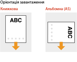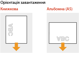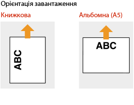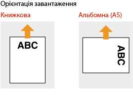 Під час виконання копіювання також звертайте увагу на орієнтацію оригінального документа.Помістіть оригінал у подавач стороною для копіювання догори або помістіть його на скло експонування стороною для копіювання донизу, як показано на ілюстраціях нижче.