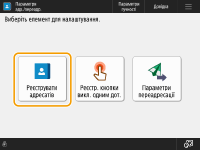 ![]() | Ви можете зареєструвати номер факсу чи адресу електронної пошти отримувача, які можна використовувати під час надсилання сканованих документів в адресну книгу. Як адресата в адресній книзі також можна зареєструвати адресата інтернет-факсів, розташування папки файлового сервера (IP-адресу та шлях) і сховище (Розширений простір) багатофункціонального принтера Canon. |