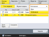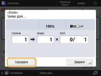 Якщо натиснути кнопку (Стоп) на панелі керування, коли в черзі є завдання копіювання, усі завдання копіювання призупиняться та з’явиться повідомлення <СтопВиберіть завдання копіювання, яке потрібно скасувати.> і список завдань копіювання. Можна вибрати завдання копіювання в списку та скасувати завдання, натиснувши кнопку <Скасувати>. Якщо потрібно поновити копіювання, натисніть <Відновити копіюв.>. |