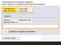 Щоб вибрати <Надіслати собі> як адресата сповіщення, потрібно заздалегідь зареєструвати власну адресу електронної пошти в розділі інформації про користувача й виконати вхід у систему за допомогою функції керування персональною автентифікацією. Реєстрація інформації користувачів на локальному пристрої |