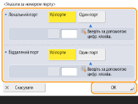 3 | Укажіть порт, до якого слід застосувати політику IPSec. Натисніть <Указати за номером порту>, щоб використовувати номери портів для визначення портів, до яких застосовується політика IPSec. Виберіть <Усі порти>, щоб застосувати політику IPSec до всіх номерів портів. Щоб застосувати політику IPSec до певного номера порту, натисніть <Один порт> і введіть номер порту. Після зазначення портів натисніть кнопку <OK>. Укажіть порт цього апарата в полі <Локальний порт>, а порт однорангового вузла зв’язку вкажіть у полі <Віддалений порт>. ![]() Натисніть <Указати за іменем служби>, щоб використовувати назви служб для визначення портів, до яких застосовується політика IPSec. Виберіть службу зі списку, натисніть <Увімк./вимк. служби>, щоб установити значення <Увімк.>, і натисніть кнопку <OK>. ![]() | ||||||||||||||
