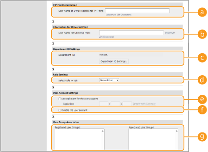 [No Expiry for Password]Установіть прапорець, щоб задати безстроковий пароль користувача, що реєструється. Цей параметр можна вказати, коли для параметра [Password Validity Period] установлено значення [Off] у [Password Settings Policy] у розділі [Authentication] у меню [Security Policy Settings].