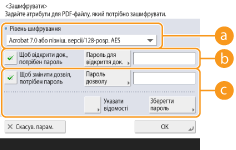 <Рівень шифрування>Виберіть рівень шифрування. Щоб використовувати рівень шифрування <Acrobat 9.0 або еквівалент / 256-розр. AES>, а не <Acrobat 10.0 або еквівалент / 256-розр. AES>, використовуйте цей параметр для змінення налаштувань.