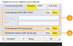 1 | Укажіть кожен елемент. ![]() <Спосіб автентиф. POP>Зазначте способи автентифікації для POP3-сервера. Щоб кодувати пароль під час автентифікації, виберіть <APOP>. Щоб виконувати автентифікацію користувачів під час прийому пошти (POP), виберіть <POP AUTH>. <Автентифікація POP перед надсил.>Щоб виконувати автентифікацію з використанням POP3-сервера, натисніть <Увімк.>. |