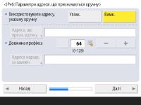 Укажіть параметри для підключення до мережі. ![]() ![]() Натисніть <Увімк.> для параметра <Використовувати IPv4> або <Використовувати IPv6>, потім натисніть <Далі>. Ви також можете водночас використовувати IPv4 і IPv6. Якщо ви натиснули <Вимк.> для параметрів <Використовувати IPv4> і <Використовувати IPv6>, а потім <OK>, пропустіть налаштування мережі і перейдіть до кроку 9. ![]() Якщо ви натиснули <Увімк.> для параметра <Використовувати IPv4>, укажіть такі параметри. ![]() Щоб отримувати IP-адресу автоматично, натисніть <DHCP> або <Авто IP>, потім натисніть <Далі> або <OK>. Щоб установлювати IP-адресу вручну, зніміть прапорець для параметра <DHCP> або <Авто IP>, натисніть <IP-адреса>, <Маска підмережі> і <Адреса шлюзу>, щоб увести кожне значення, і натисніть <Далі> або <OK>. Інформацію про налаштування адреси IPv4 див. в розділі Установлення адреси IPv4. ![]() Якщо ви натиснули <Увімк.> для параметра <Використовувати IPv6>, укажіть такі параметри. ![]() Натисніть <Увімк.>, щоб використовувати адресу без збереження стану, або <Вимк.>, щоб не використовувати адресу без збереження стану, а потім натисніть <Далі>. Інформацію про адресу IPv6 див. в розділі Установлення адреси IPv6. ![]() Після зазначення адреси без збереження стану вкажіть наведені нижче параметри. ![]() Натисніть <Увімк.>, щоб використовувати адресу, що призначається вручну, або <Вимк.>, щоб не використовувати адресу, що призначається вручну, а потім натисніть <Далі>. Щоб використовувати адресу, що призначається вручну, натисніть <Адреса, що призн. вручну>, <Довжина префікса> і <Адреса маршр. за замовч.> для введення кожного значення. ![]() Після зазначення адреси, що призначається вручну, укажіть наведені нижче параметри. ![]() Натисніть <Увімк.>, щоб використовувати DHCPv6, або <Вимк.>, щоб не використовувати DHCPv6, і натисніть <OK>. | |