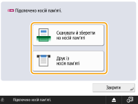 Якщо для параметра <Вибрати варіант під час підключення носія пам’яті> встановлено значення <Увімк.>, під час вставлення носія пам’яті відображаються ярлики доступних функцій. <Вибрати варіант під час підключення носія пам’яті> ![]() Оскільки ярлики можуть не відображатися, якщо апарат перейшов у режим сну, вставте носій пам’яті після того, які апарат вийде з цього режиму. |