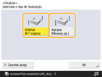 Ao copiar duas cópias ou mais a partir do alimentador, é possível selecionar a ordenação ou o agrupamento para a ordem das impressões. Selecione "Ordenar" para imprimir numa ordem de páginas sequencial. Selecione "Agrupar" para imprimir lotes de cada página como, por exemplo, 10 folhas para a primeira página, 10 folhas para a segunda página e assim sucessivamente.