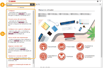 Clique para visualizar informações sobre como ver o Manual do utilizador, como efetuar uma procura e outras informações.