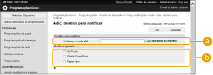 Clique em [Gestão do dispositivo] [Progs notificação e-mail]  [Adic. destino para notificar].