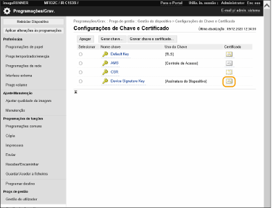 Os certificados gerados nesta máquina não têm uma assinatura da CA, o que pode causar erros de comunicação com alguns pares de comunicação. Para solicitar um certificado com assinatura da CA, são necessários dados de solicitação de assinatura de certificado (CSR). Um utilizador que inicie sessão com privilégios de administrador pode gerar uma CSR.