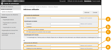Selecione a caixa de verificação para definir a palavra passe do utilizador a registar como não tendo data de expiração. Esta configuração pode ser utilizada quando o item [Período de Validade da Senha] está configurado como [Desligado] em [Política de Configurações de Senha] em [Autenticação] em [Programações de política de segurança].