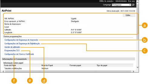 Permite verificar os valores introduzidos nas definições de AirPrint, como o nome e a localização da máquina. Pode clicar em [Editar] para alterar as definições.