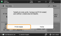 Se o item <Mostrar notificação quando trabalho for aceite> for programado para <Ligado>, é possível aceder ao ecrã <Contr. estado> a partir do ecrã seguinte que é mostrado após a receção de um trabalho de envio. <Mostrar notificação quando trabalho for aceite>