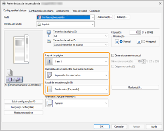 Enquanto verifica o ecrã de pré-visualização, programe [Layout da página] [Ordem das páginas] [Impressão de um lado/dos dois lados/de livreto] [Local de encadernação].