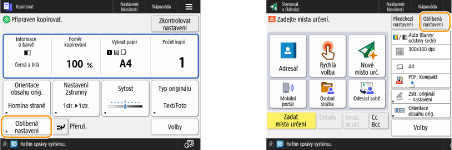 Tlačítka nastavení, která se zobrazují na obrazovce základních funkcí (pro kopírování, faxování a skenování), můžete změnit. Můžete také zobrazit jinou obrazovku základní ch funkcí, která bude přizpůsobená pro každého přihlášeného uživatele.