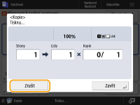 (Stop) na ovládacím panelu, když je zobrazena obrazovka Základní funkce pro kopírování, bude tisková úloha přerušena a objeví se zpráva <StopVyberte kopírovací úlohu, kterou chcete zrušit.> a také seznam kopírovacích úloh. Z tohoto seznamu můžete vybrat kopírovací úlohu a zrušit ji stisknutím <Zrušit>.Pokud se přihlásíte pomocí osobní autentizační správy a pokud se odhlásíte po stisknutí tlačítka