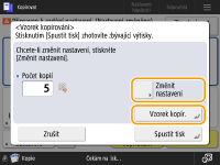 Stiskněte <Změnit nastavení>, chcete-li změnit nastavení. Po provedení změn nastavení se zobrazí <Vzorek kopírování>. Zhotovte znovu vzorek kopírování.