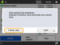 Je-li možnost <Zobrazit oznámení při akceptování úlohy> nastavena na <Zap>, lze z obrazovky zobrazené po přijetí úlohy odesílání zobrazit obrazovku <Monitor stavu>. <Zobrazit oznámení při akceptování úlohy>