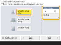 Jestliže se velikost zobrazená v <Velik. originálu> liší od velikosti originálu, stiskněte <Změnit> a vyberte velikost. Režim Smazání rámu originálu můžete nastavit pouze pro velikosti originálu zobrazené na displeji dotekového panelu.
