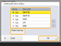 Stiskněte <Zadat podle názvu služby>, chcete-li používat názvy služeb při zadávání portů, pro něž se má používat IPSec. Vyberte službu v seznamu, stisknutím <Služba Zap/Vyp> ji nastavte na <Zap> a stiskněte <OK>.