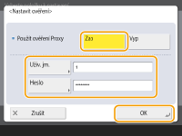 Chcete-li používat funkci ověření proxy serveru, stiskněte toto tlačítko a nastavte informace pro ověření. Na zobrazené obrazovce stiskněte <Zap>, zadejte uživatelské jméno a heslo pro ověření proxy serveru a stiskněte <OK>.