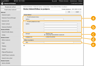 Na displeji dotekového panelu lze zobrazovat zprávy pro uživatele. Zprávy se mohou zobrazovat v dolní části displeje dotekového panelu nebo v samostatném překryvném okně a způsob zobrazení můžete vybrat podle typu zprávy nebo uživatele. Když se zpráva zobrazí v překryvném okně, můžete stejnou zprávu zobrazit také na portálové stránce Remote UI (Vzdálené UR). Pro zadání těchto nastavení jsou vyžadována přístupová práva administrátora (správce).