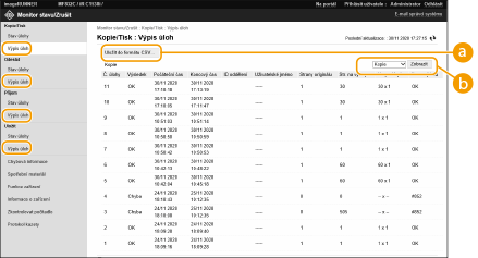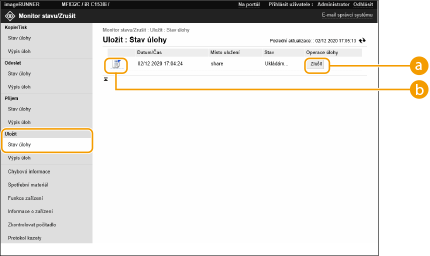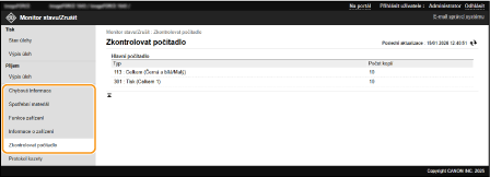 S pomocí Remote UI (Vzdálené UR) můžete zkontrolovat stav dokumentů, které čekají na zpracování, a také výpisy pro dokumenty, které již byly zpracovány. Můžete také zkontrolovat stav stroje, například informace o chybách a zbývající množství spotřebního materiálu.