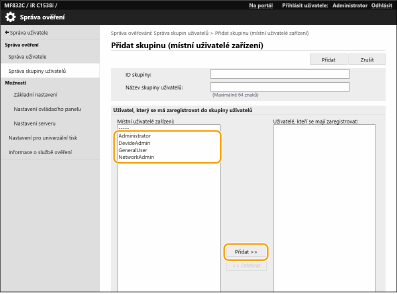 Vyberte uživatele, které chcete uložit ve skupině uživatelů, a klikněte na [Přidat >>].